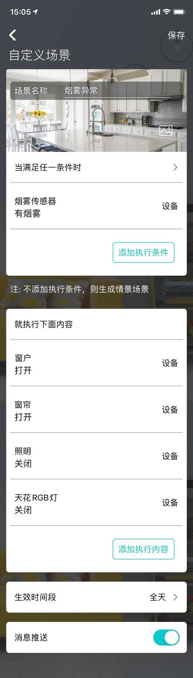 廚房安裝燃氣傳感器,當感應到(dào)燃(rán)氣泄露時,用戶可(kě)以及(jí)時受到推送並采取措施;在預(yù)設的場景模式中,將會(huì)聯動(dòng)關閉燃氣閥門,同時開啟推(tuī)窗器開窗通風。